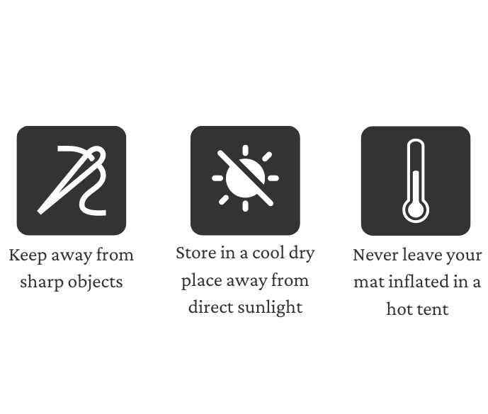 With care your sleeping mat should last many years but prevention is always better than the cure and so will last longer and perform better if cared for correctly. During use keep your mat away from sharp surfaces or objects as well as pets and always keep the valve open when not in use. After use, your sleeping mat should be dried thoroughly and stored in a cool dry place away from direct sunlight. Never leave a mat inflated in a hot tent as the rising temperature and subsequent pressure inside the mat can cause them to fail irreparably.