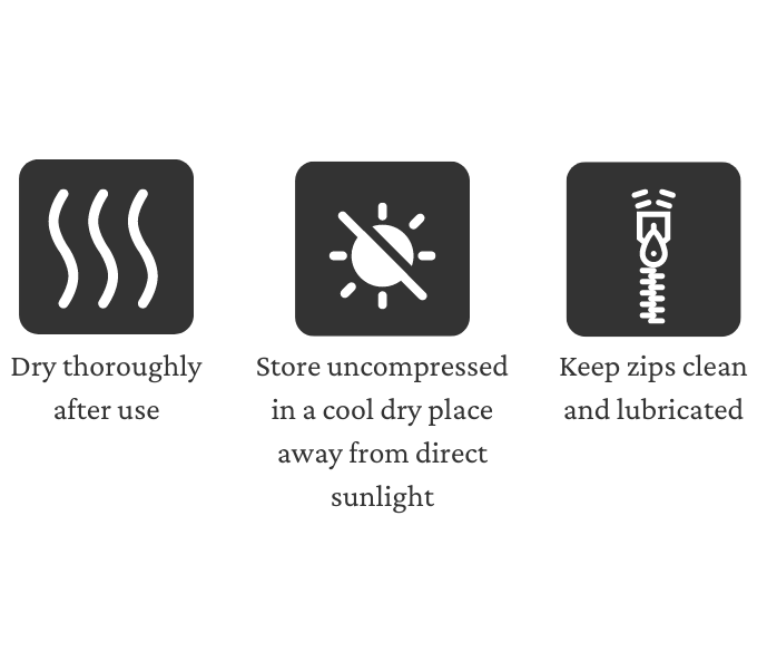 When not in use, store your sleeping bag in a cool dry place away from direct sunlight; store uncompressed, loose in a large box or pillow case. If possible avoid storing inside its stuff-sack for long periods of time. Small stains and spillages can usually be cleaned with a damp soapy cloth but avoid washing your bag unless it really needs it. Zips should be kept clean and regularly lubed.